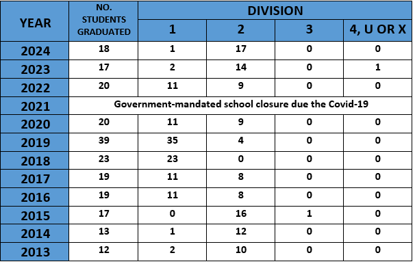 Victory Primary School is proud to share that they are one of the top performing schools in the district. Each year, students are ranked on their final (Primary 7) exam in divisions from 1 to 4, with 1 being the highest ranking. If students do not receive a pass mark, they are graded a ‘U’. If a student does not attend examinations, they are graded an ‘X’.